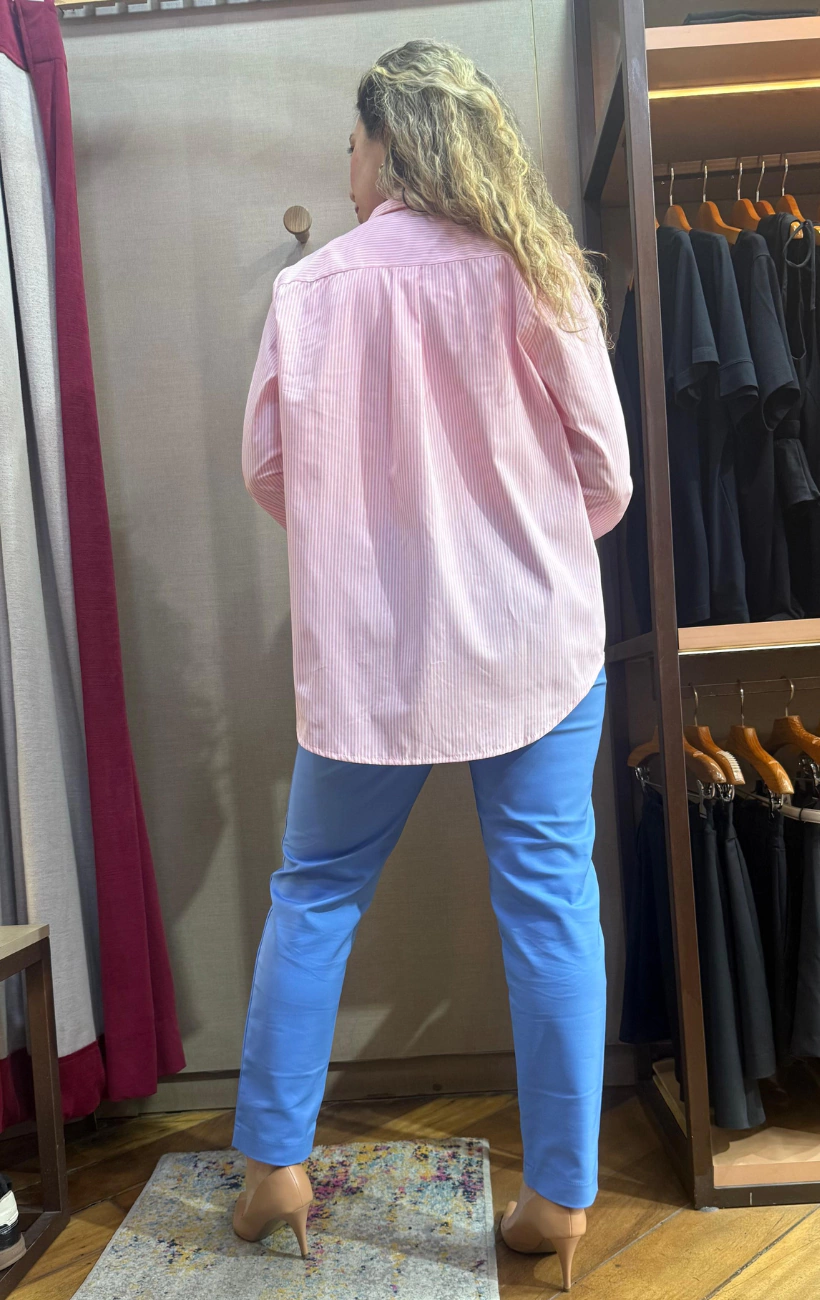 modelagem: Camisa feminina confeccionada em 100% algodão, garantindo conforto, respirabilidade e toque suave à pele. Possui modelagem clássica, com gola estruturada, fechamento por botões frontais e mangas longas com punho ajustável, perfeita para compor looks elegantes e modernos. O tecido em listras finas rosa e branco traz um toque delicado e sofisticado, ideal tanto para o dia a dia quanto para produções mais formais. Uma peça atemporal e versátil, que combina com jeans, alfaiataria ou couro, elevando qualquer produção com estilo.