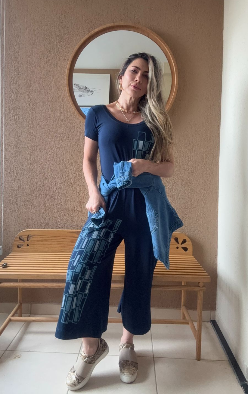 Modelagem: O Macacão Pantacourt é a peça ideal para quem busca estilo moderno com conforto absoluto. Confeccionado em malha leve e macia, ele traz um caimento fluido que valoriza o corpo sem marcar, perfeito para o dia a dia ou ocasiões casuais com um toque de sofisticação. O destaque fica por conta da estampa geométrica exclusiva em tons contrastantes, que traz personalidade ao look de forma discreta e elegante. A modelagem ampla, com comprimento pantacourt, permite liberdade de movimentos e um visual despojado-chique. Possui bolsos laterais funcionais e decote arredondado.