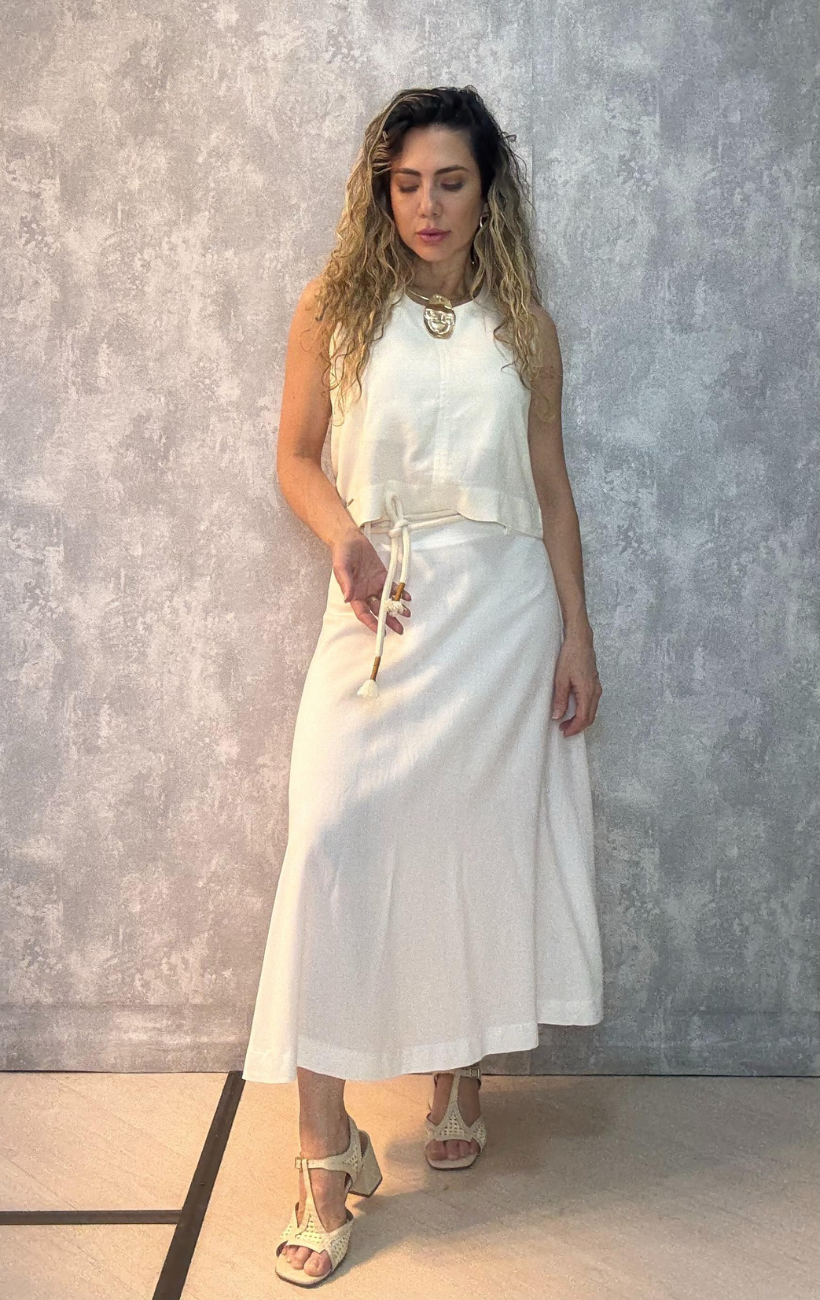 Combinando perfeitamente, a saia godê Donna realça o movimento e o caimento fluido do tecido. Sua modelagem evasê proporciona um balanço leve e feminino, valorizando a silhueta com conforto. O detalhe do cordão na cintura adiciona charme artesanal e um toque sofisticado.